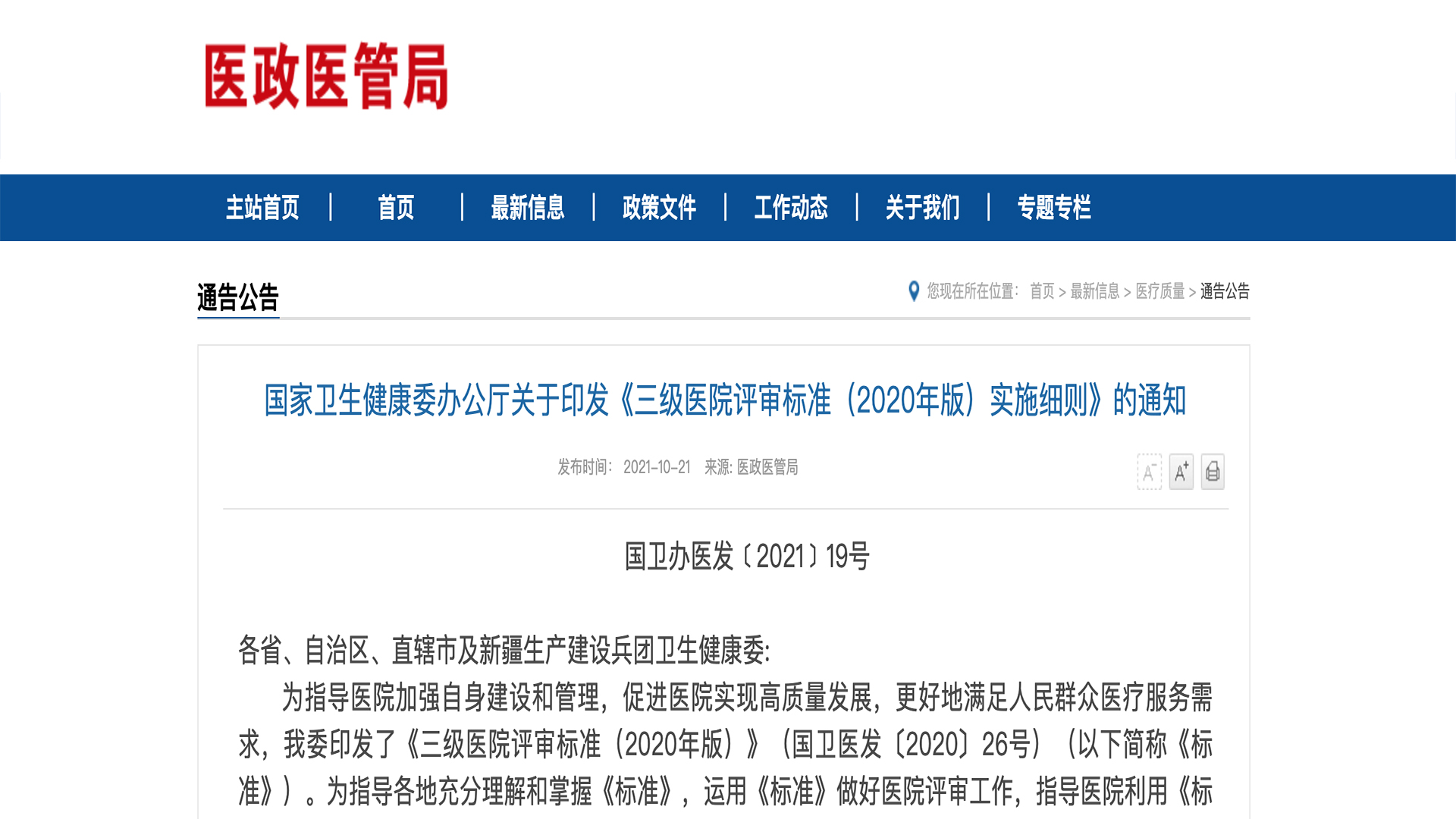 10月22日,国家卫生健康委发布《三级医院评审标准(2020 年版)实施细则》。