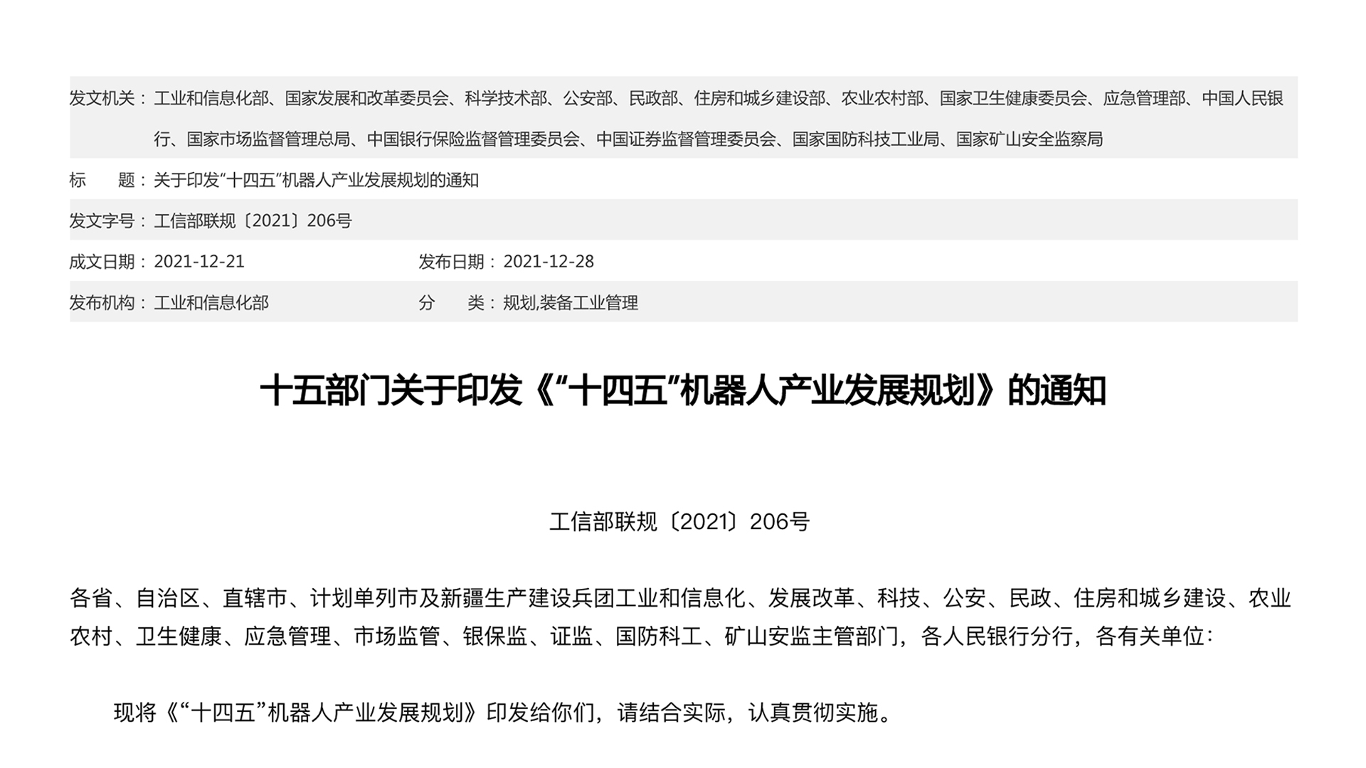 工信部等15部门联合印发《“十四五”机器人产业发展规划》